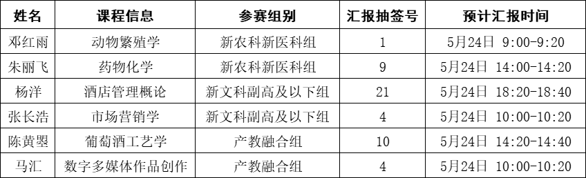 我校共有6名教师参加本次总决赛,其中,邓红雨老师、朱丽飞老师在新农科组,张长浩老师、杨洋老师在新文科组,陈黄曌老师、马汇老师在产教融合组。具体信息如下: